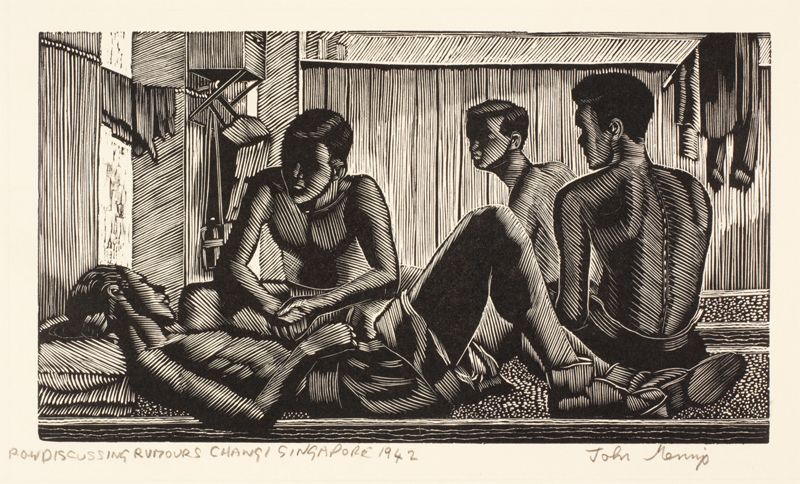 POW Discussing Rumours, Changi, Singapore 1942. |